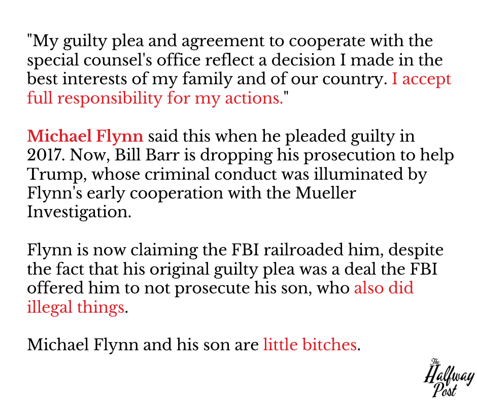 “But Michael Flynn did absolutely no wrong! And he said he was sorry anyway, so what does it matter? I’m a very forgiving person, so I think America should just move on and not look deeper into Flynn’s original claims because those were fake news that made me look bad!”
