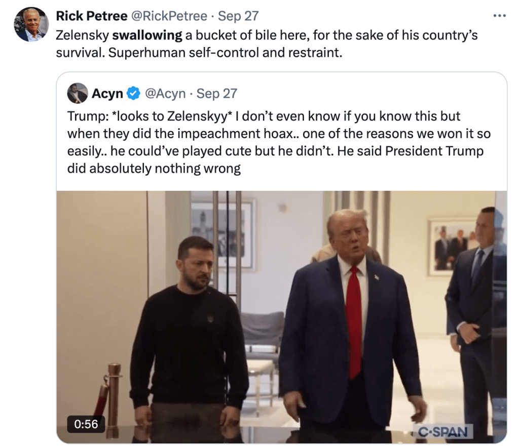 Everyone knows he’s trying to collude again. Kamala has a consistent edge in the Rust Belt state polls that get her to 270 and Democratic senators are consistently outpolling their Republicans opponents in the presidential swing states, and Trump knows he’s fucked in court if he can’t win presidential immunity and cancel his own trials. Excuse me for my possible naivety, but isn’t there at least a little Deep State? Virtually everything Trump has done in his entire life is corrupt and self-serving, and he’s meeting with a bunch of foreign leaders who don’t give a shit about America’s national interests when he’s not the sitting president, and he’s got a long record of suspicion around the plausible $10 million Egyptian bailout, his son-in-law’s preposterous $2 billion gift from the Saudis, his public requests for Russia to hack his opponent’s emails, his endless grifting bribe-soliciting with dumb NFTs, gaudy clothing, and gauche merch, and his ceaseless need for liquid cash to pay lawyer fees, court fines, and sex-crime-related lawsuits. There is no conflict of interest Donald Trump does not have a broke bitch lizard brain focus on pursuing. Isn’t Deep State surveillance a little important for national security and sovereignty when the president is having secret talks in the resort Trump got caught stealing and hiding classified documents in? Surely there’s enough evidence for warrants for finding out what he’s offering Benjamin Netanyahu and the Sunni Gulf monarchies in exchange for campaign collusion or indirect cash payments through his hotels, golf courses, or merch. Meanwhile, Trump had an obligatory meeting with Zelenskyy and Donald Trump’s thoughts on their conversation were predictably worthless and utterly unserious: